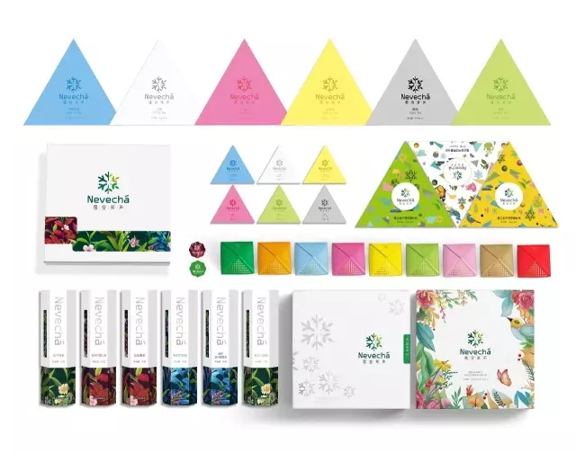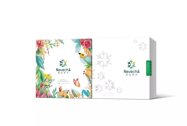 設(shè)計(jì)元素采用“雪宜茶聲”LOGO標(biāo)識為主題,增加品牌識別度和市場印象;禮品包裝插畫風(fēng)格,運(yùn)用雪花、茶壺、小石塊、綠色植物、鳥蟲等元素,勾勒出一幅生態(tài)、自然、安逸場景,突出包裝清新自然的視覺效果;包裝盒采用三角型的形式設(shè)計(jì),即便于禮盒裝的組成,又突出年輕人對喝茶的一種精神訴求,喝茶就是享受生活,追求夢想,釋放青春的一種平衡性;內(nèi)包裝盒色調(diào)根據(jù)不同茶類型,選用不同色彩,但整體視覺主要以淡雅、粉嫩為主,即符合茶的原本形態(tài),又迎合了時(shí)尚化、年輕化創(chuàng)意。
